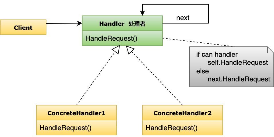- Client(客户端):创建处理链,并向链的第一个处理者对象提交请求。