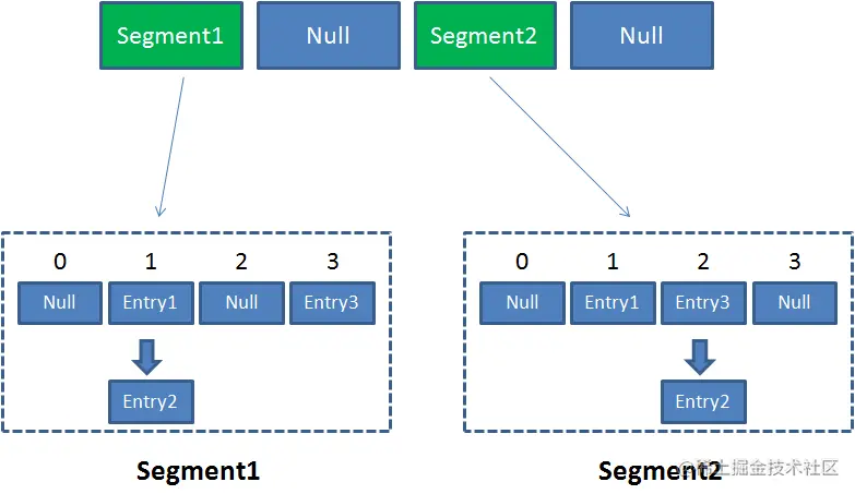 像这样的 Segment 对象,在 ConcurrentHashMap 集合中有多少个呢?有 2 的 N 次方个,共同保存在一个名为 segments 的数组当中。 因此整个 ConcurrentHashMap 的结构如下: