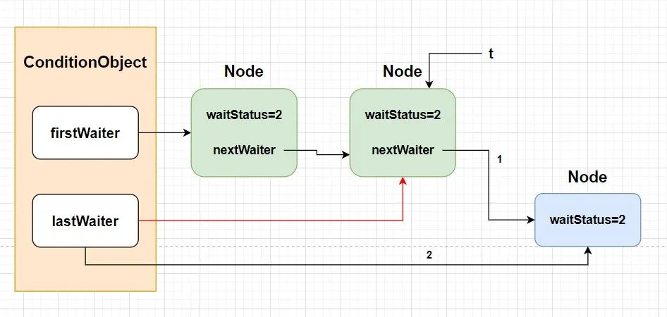 }Node 中的 nextWaiter 指向队列中的下一个节点。并且进入到等待队列的 Node 节点状态都会被设置为 CONDITION(下面的 demo 中可以看得到)。