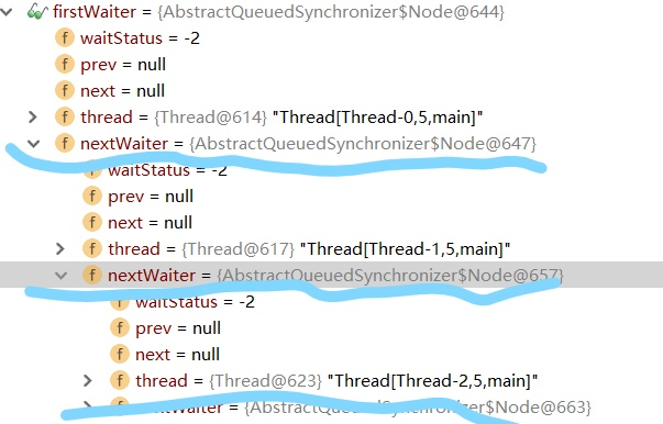 - 调用 condition.await 方法后线程依次尾插入到了等待队列中,依次为 Thread-0,Thread-1,Thread-2....Thread-8;
