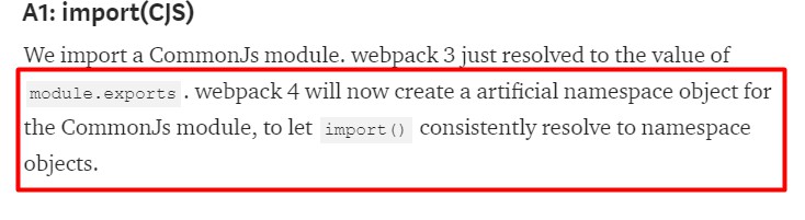 import(cjs) 这种场景下,webpack3会把module.exports返回来,webpack4会包装一层成object = { default: xx }返回来,并把default的properties assign到这个object上,方便解构使用