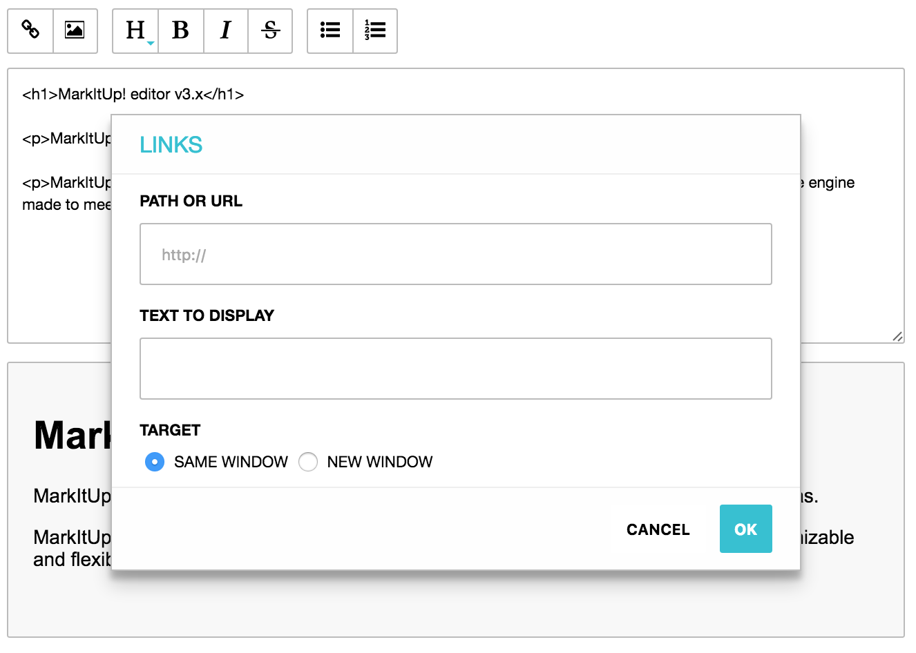 Home: http://markitup.jaysalvat.com/