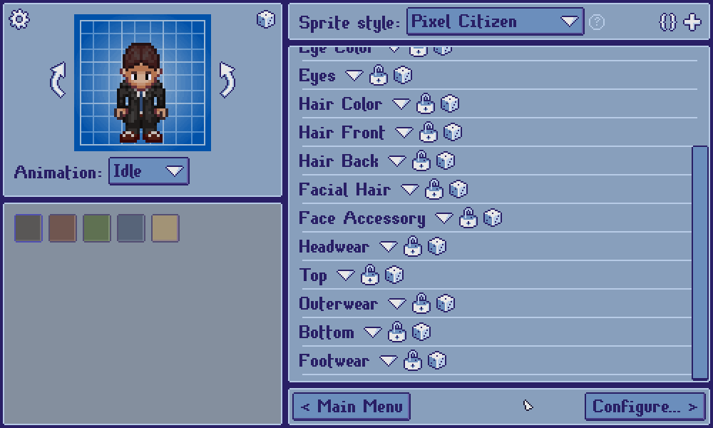 - Controlled randomization: Generate random sprites with the click of a button. Randomization can be constrained by locking customization layers you wish to exclude. [ screenshot ]