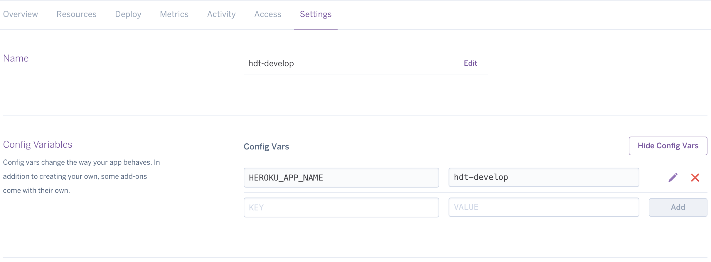 You should have something similar to the below image, where you can see the pipeline stage app name is hdt-develop and the value of the HEROKU_APP_NAME variable is also hdt-develop: