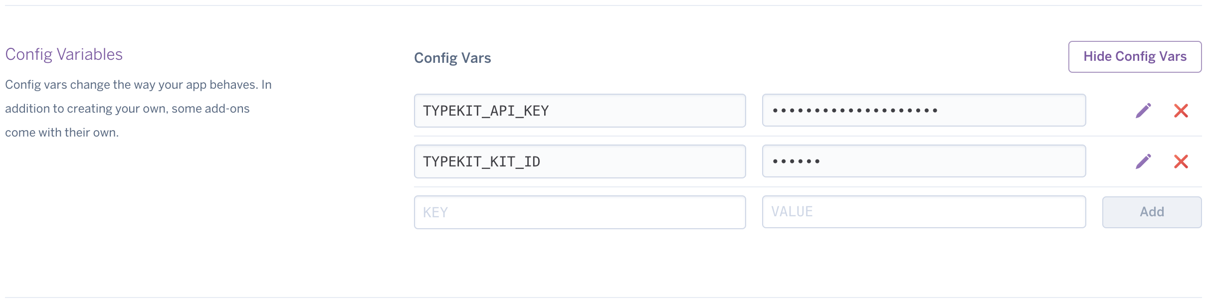 Because the pipeline stage apps work differetly to review apps, it means we need to manually add a environment variable to each of the stage apps. You will only need to do this if you're wanting to use the *.herokuapp.com sub-domain as apposed to a custom domain - if you're using a custom domain, you should add it to Typekit manually.