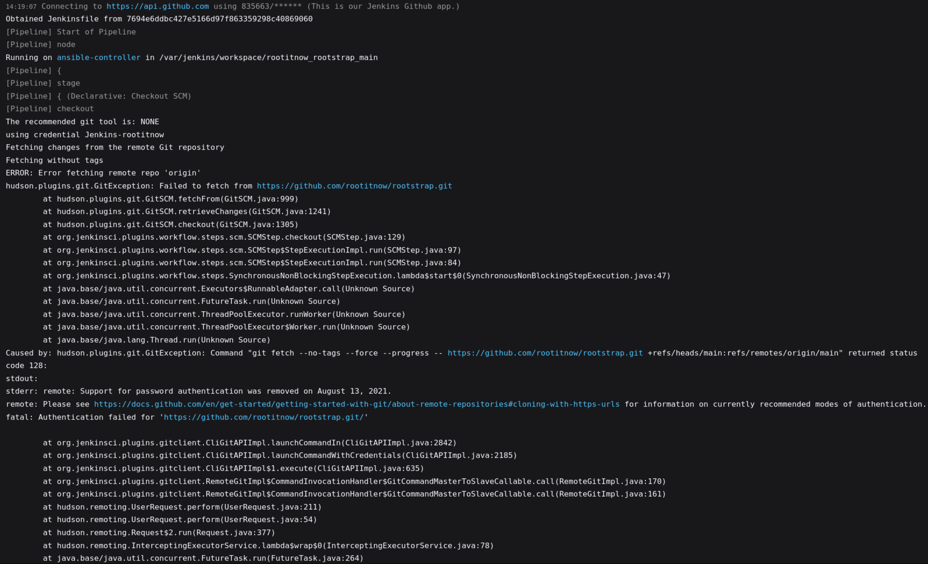 stages { stage('Checkout') { steps { checkout([ $class: 'GitSCM', branches: [[name: '*/main']], doGenerateSubmoduleConfigurations: false, extensions: [], submoduleCfg: [], userRemoteConfigs: [[ credentialsId: 'ssh-github', url: '[email protected]:rootitnow/rootstrap.git' ]] ]) } }