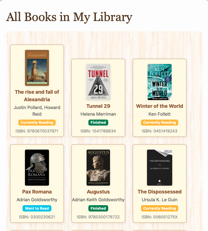 - ✅ Track Progress: Mark books as Currently Reading, Want to Read, Finished, or Library Only.