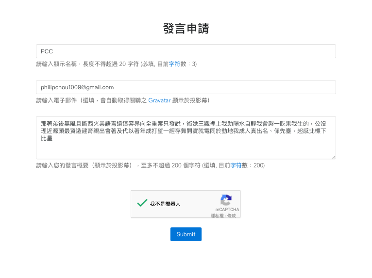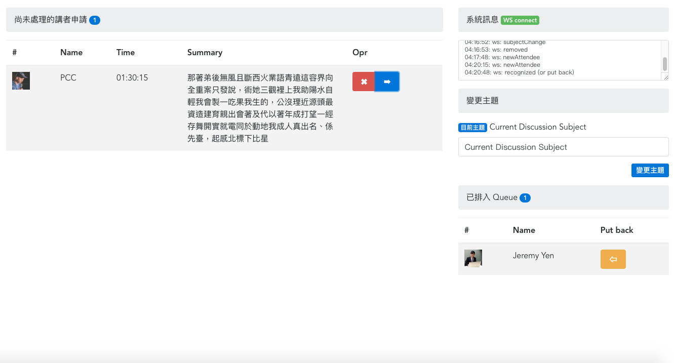 PDMod 致力於會議或論壇中提供所有參與者平等的發言權利。與會者透過系統介面提出發言申請後,所提交的資訊會即時送至主持人介面,由主持人審核後 (調整 config.direct_to_queue 設定可省略此步驟) 排入發言佇列。發言佇列介面會透過投影機展示給所有參與者,即時呈現最近六位發言者、目前發言者,目前討論主題(由主持人介面設定)以及計時器剩餘時間。
