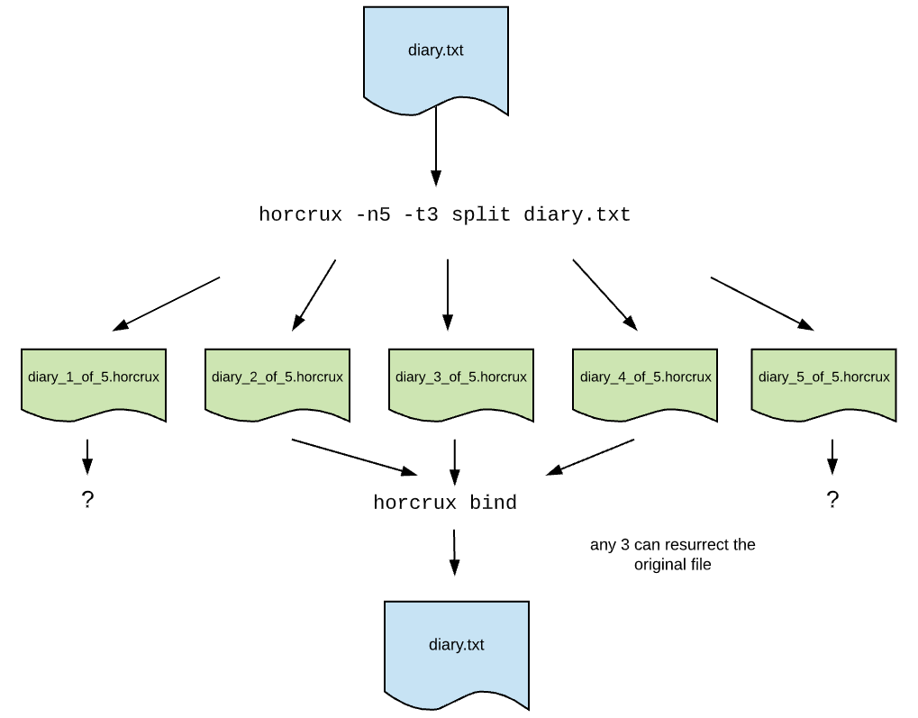 and it will prompt me for how many horcruxes I want, and how many will be needed to resurrect the original file. For example I might want 5 horcruxes with the ability to resurrect the file if I have any 3. The horcrux files will be created like so: