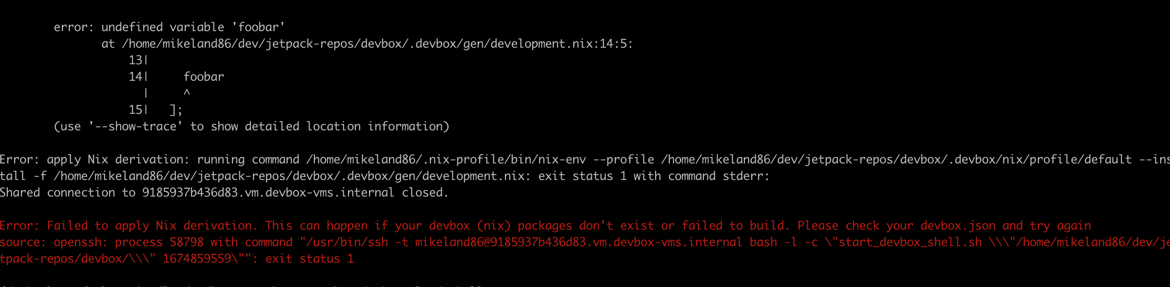 | 52 | + "Failed to apply Nix derivation. This can happen if your devbox (nix) "+ |