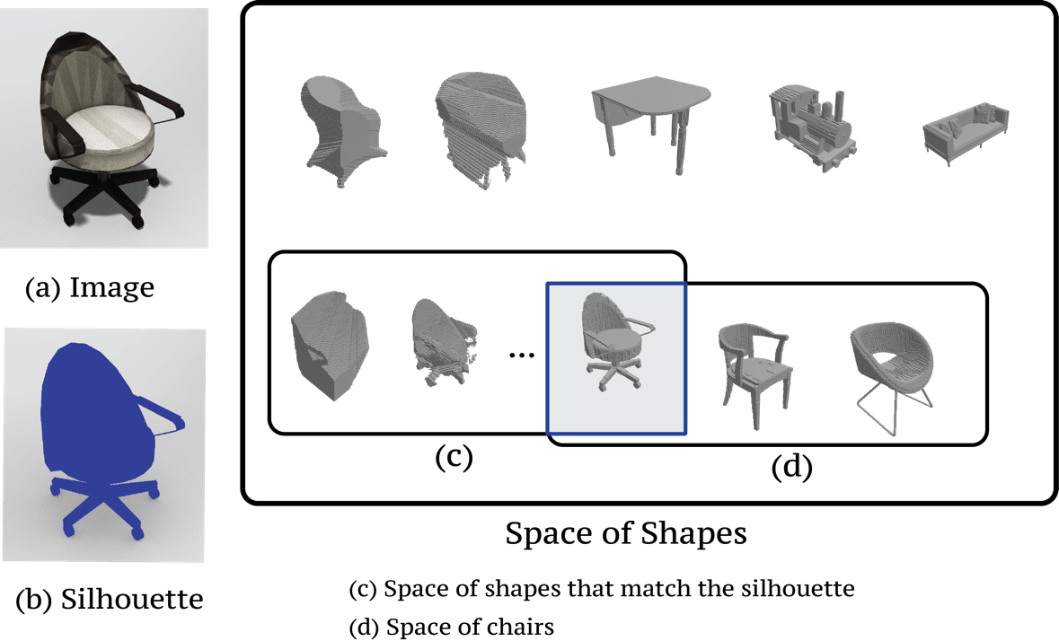 - Adversarial Constraint: Since the 3D reconstruction from masks is an ill posed problem, we propose to constrain the 3D reconstruction to the manifold of unlabeled realistic 3D shapes that match mask observations ((d) in the figure above)