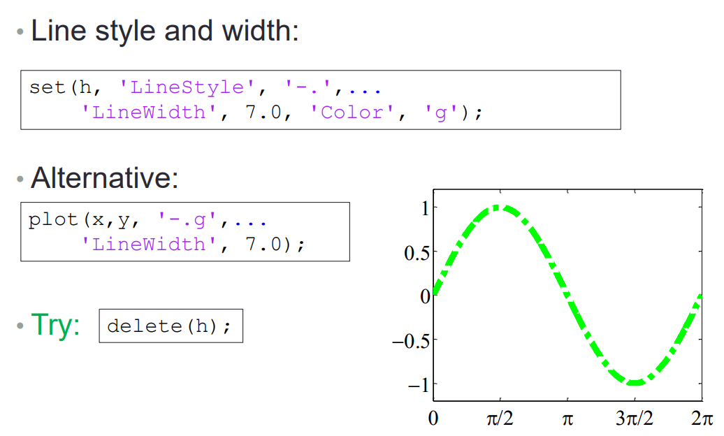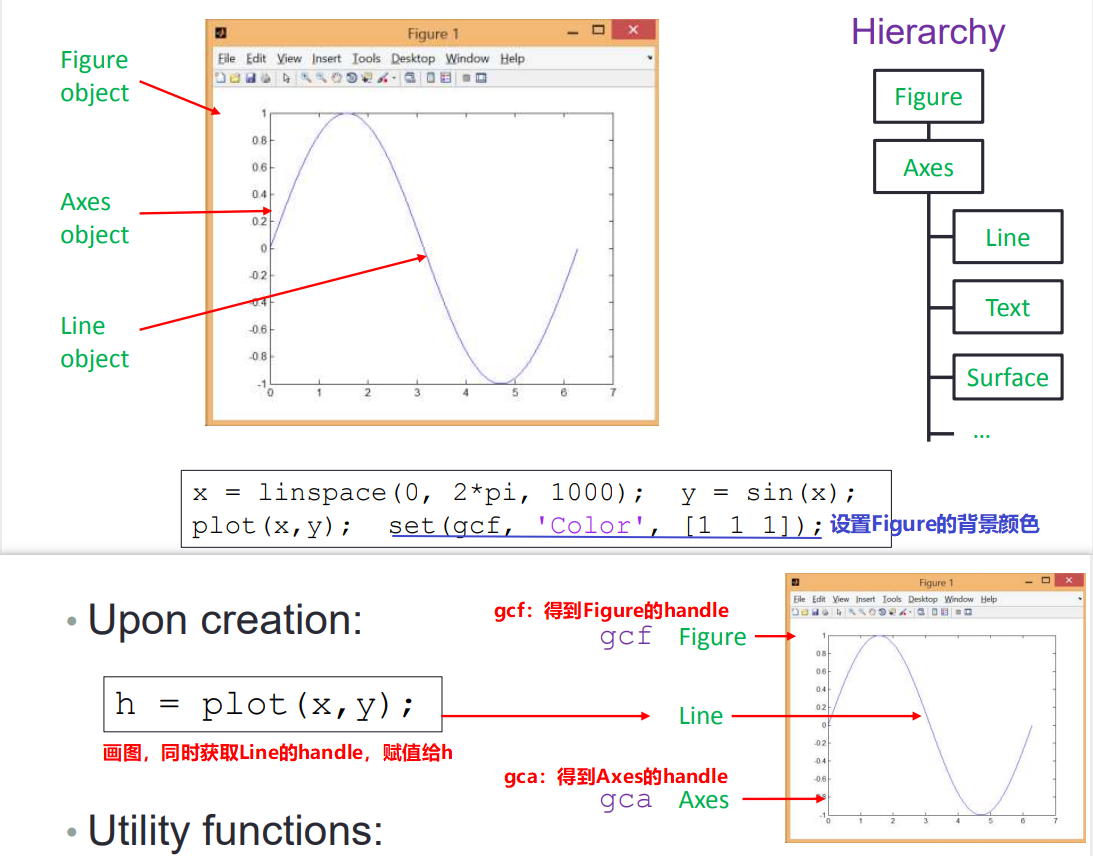 h = plot(x,y)可以使h得到画出图形中 Line 的 handle (类似于file id),以后便可以通过 h 来改变 Line 的一些属性;gcf、gca也类似 -