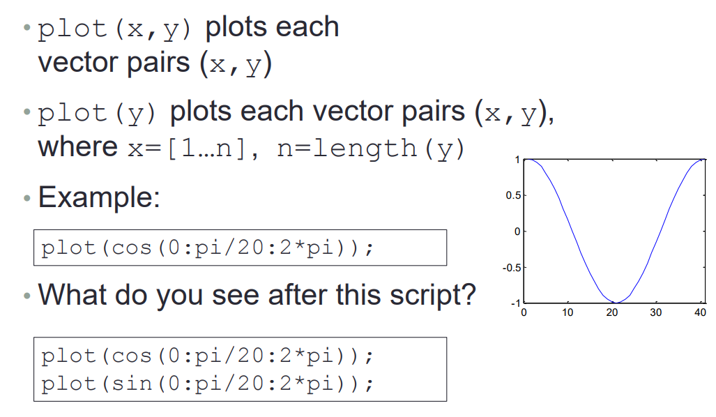 plot(x,y):如果 X 和 Y 都是向量,则它们的长度必须相同,plot 函数绘制 Y 对 X 的图;- 如果 X 和 Y 均为矩阵,则它们的大小必须相同,plot 函数绘制 Y 的列对 X 的列的图(即矩阵X的第1列的数据记为一个vector:x1,Y的第一列记为一个vector:y1,plot(x1, y2),第2, 3, 4…列类似。将对应的每一列绘制成一个单独的线条)。如: