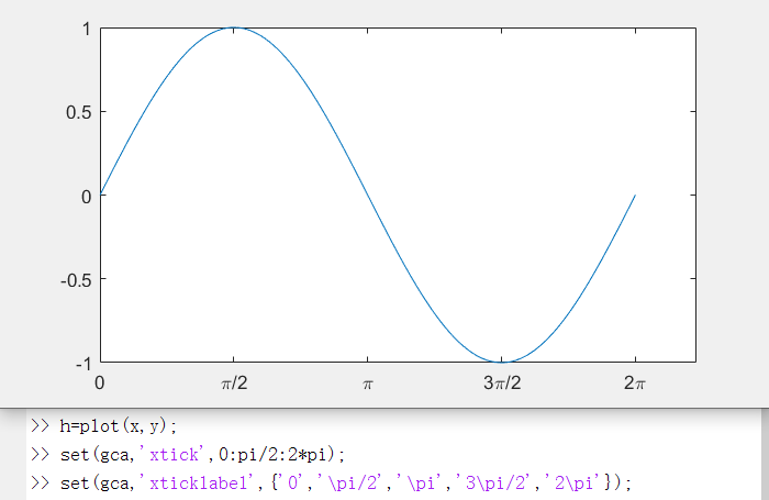 set(gca,'xticklabel',{'0','\pi/2','\pi','3\pi/2','2\pi'});- delete(h):将画好的图形清除;