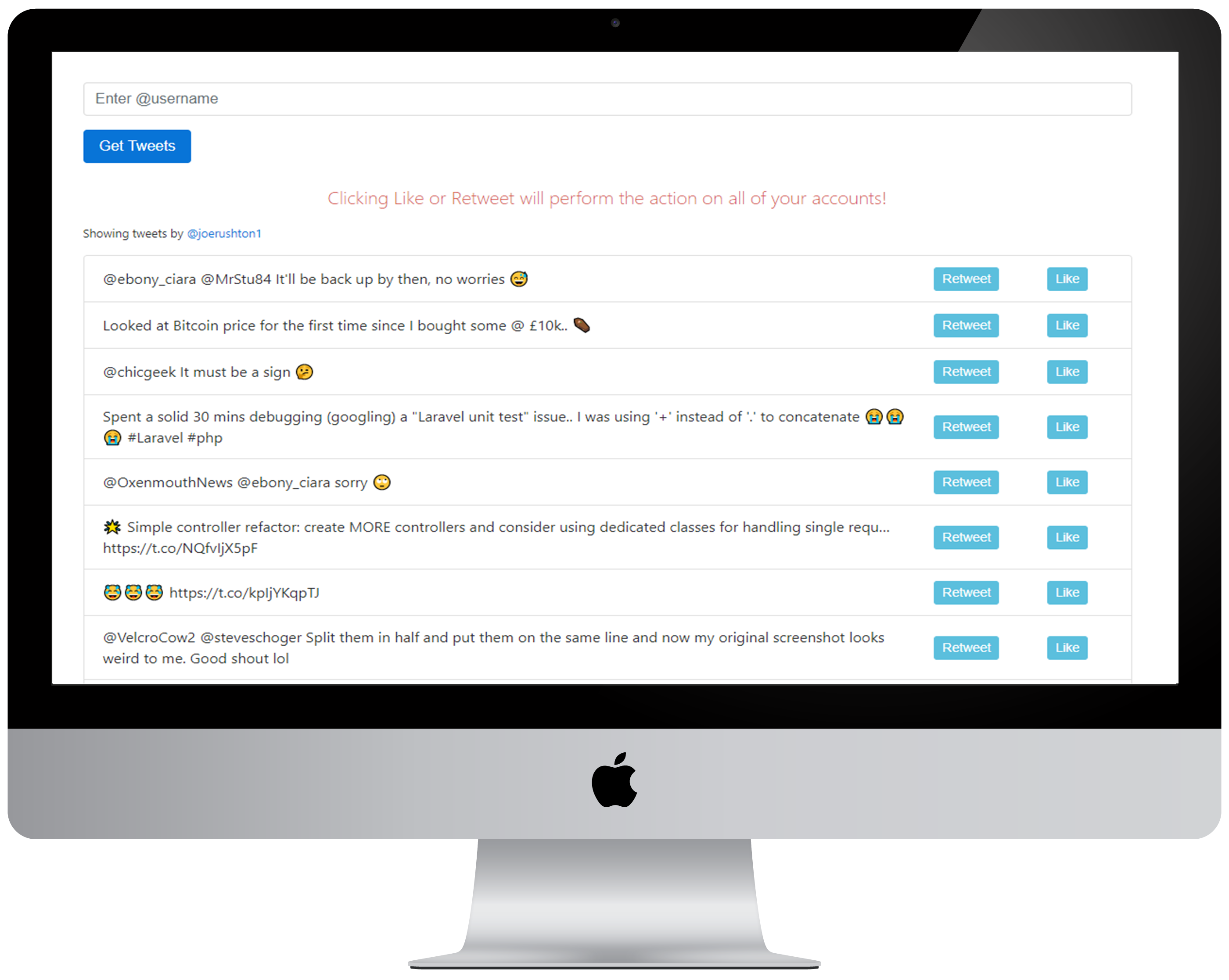 Retweetr is a simple database-free PHP twitter bot which offers multi-account retweeting/liking. You can retweet/like a single tweet across multiple accounts simultaneously within a few minutes of set-up.