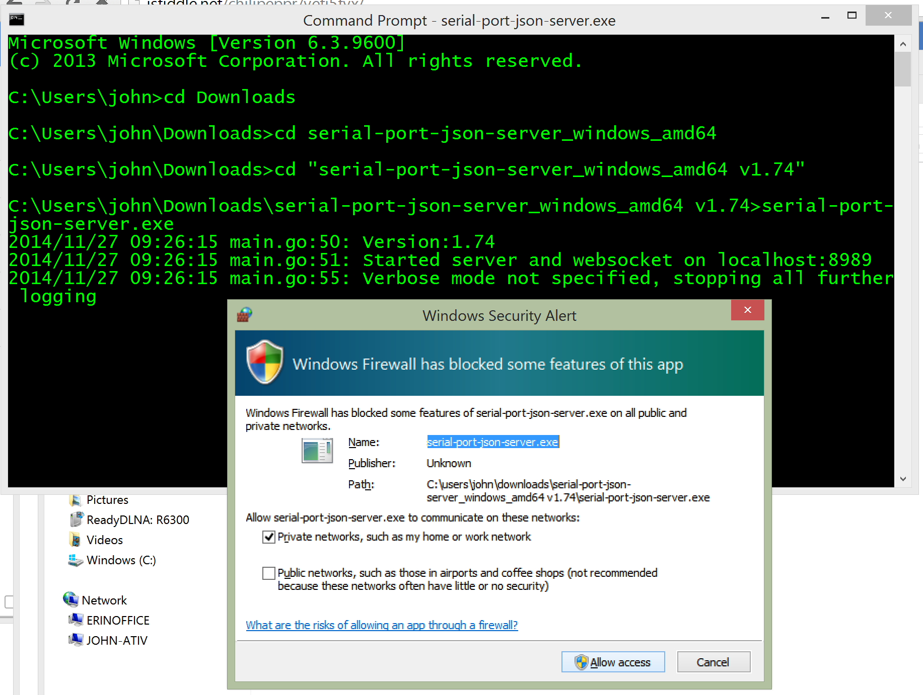 - If you have a firewall on the computer running the serial-port-json-server you must allow port 8989 in the firewall.