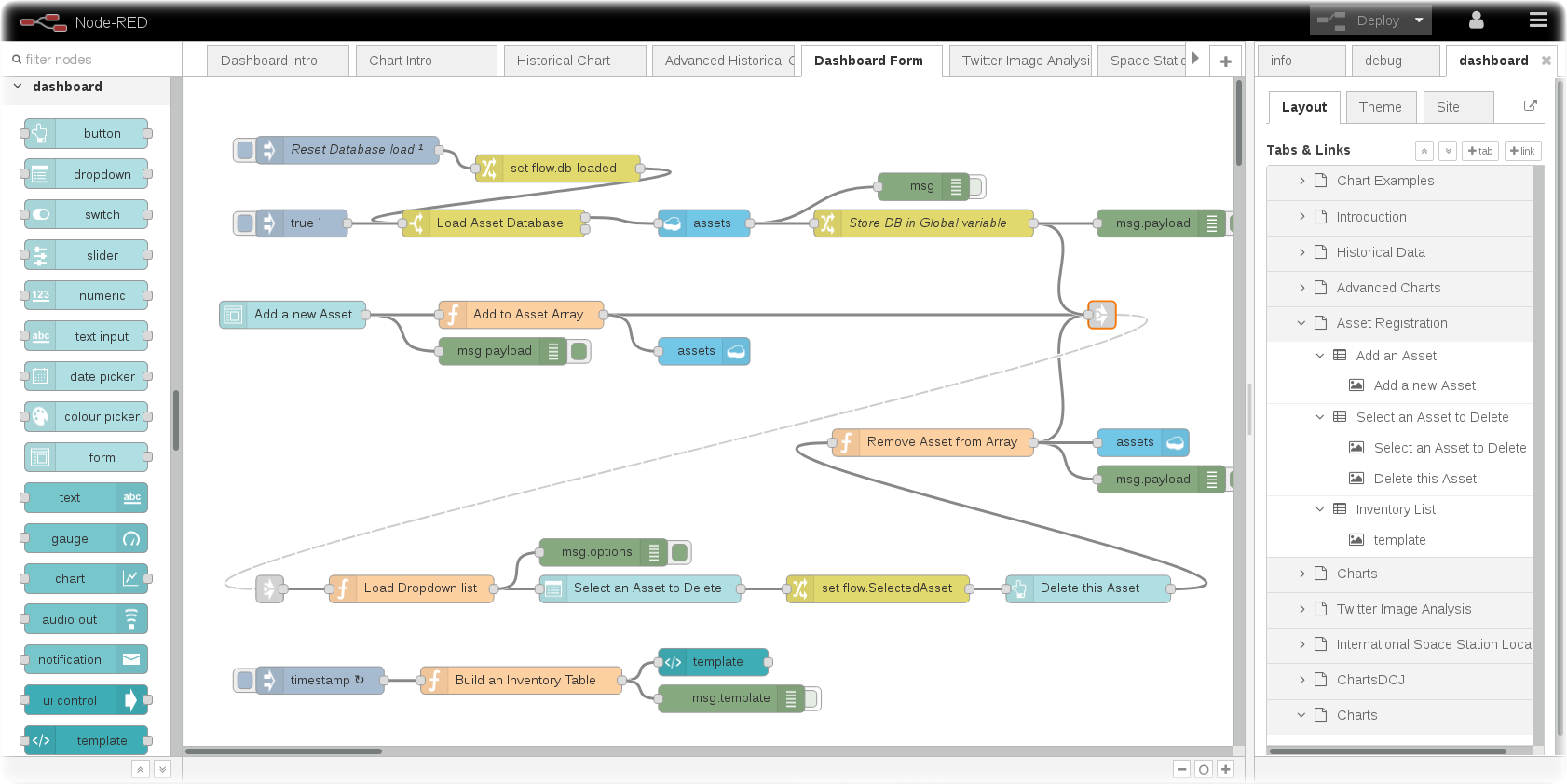 Coursera - Developers Guide to Node-RED Lecture 4 - Node-RED Dashboard Forms and Templates - Resources Review the Lecture 4 Node-RED Dashboard Forms and Template slides Slides Download the Lecture 4 Example flows Lecture 4 Asset Registration Form Example flow Lecture 4 International Space Station Template Example flow Screenshots of Lecture 4 Node-RED Forms and Templates