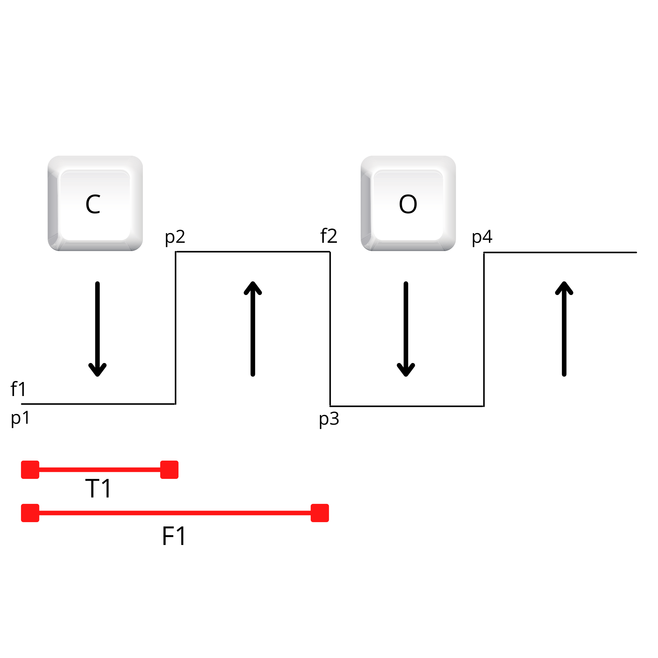 The Figure shows the elements that compose the typing data, being characterized by p Thus p1 represents the first time the key was pressed. This is the current time of the press. After the key is released, p2 is obtained, storing the time the key was released. In this way, the keypress time or Dwell Time, identified by T, is done by subtracting the values of p1 and p2. Where, T1 represents the time of pressing the first key.