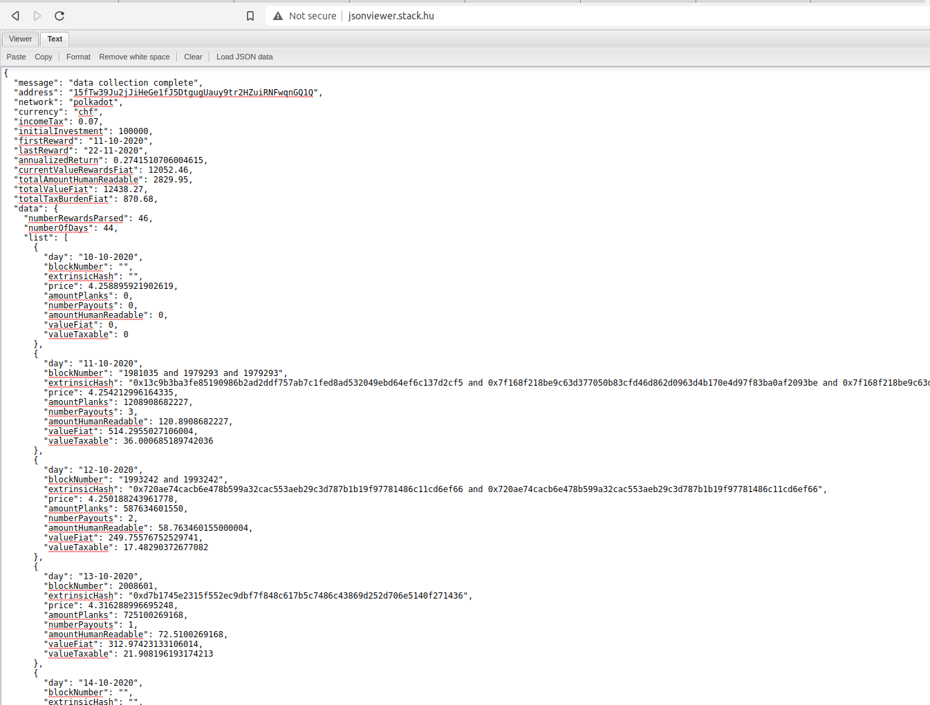 The JSON output file contains a summary of the data as well as a list of objects for every day of the specified time-period (regardless of whether staking rewards occured). If your standard OS text editor does not format the file properly, you can copy the data and insert it to http://jsonviewer.stack.hu/ (click at "format" after paste). Example output: