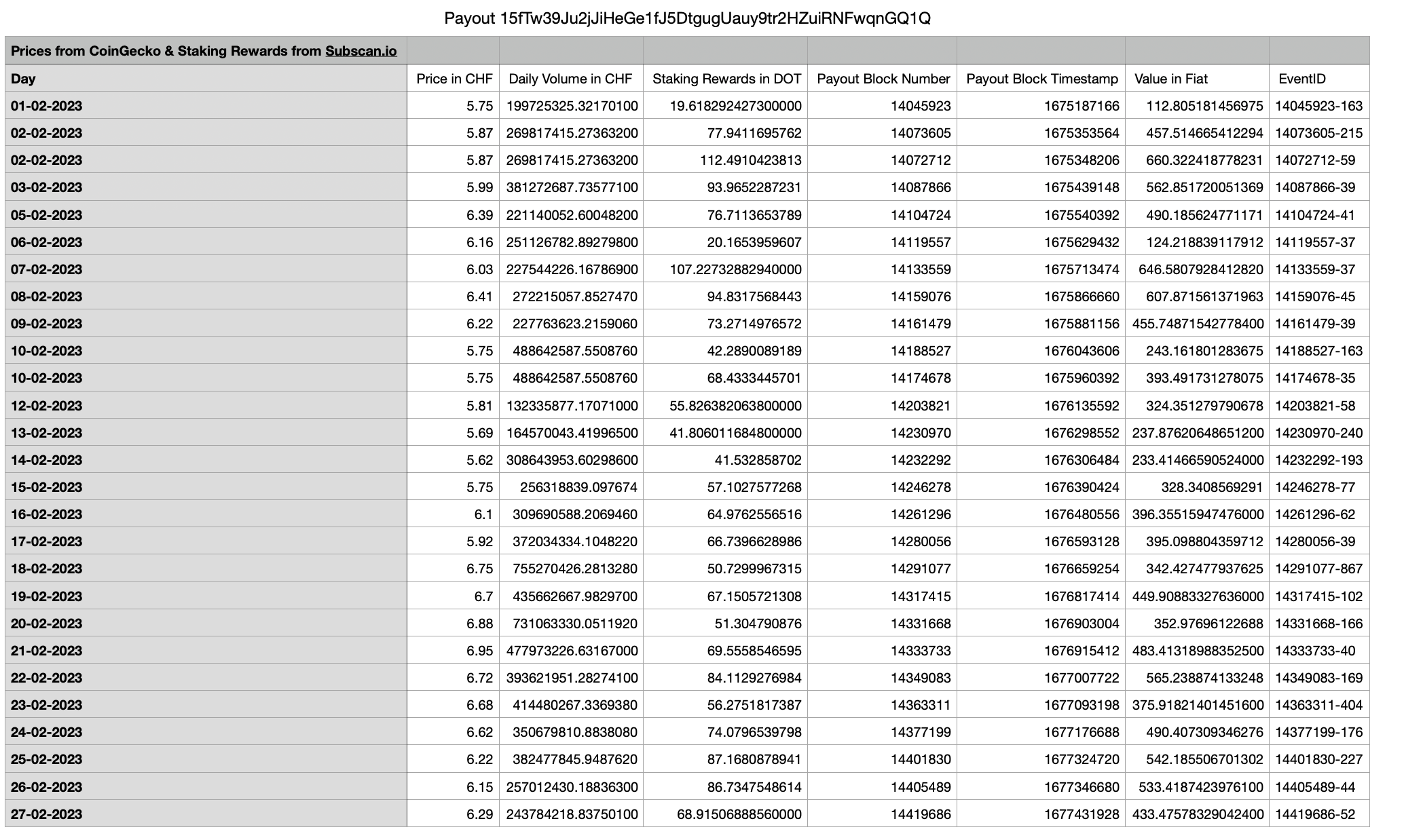 A list with objects for every day in your specified range. In the price of numbers (e.g. amountPlank) multiple staking rewards are added. In the case of strings, those are concanated.