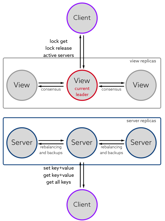 A Haskell implementation of distributed hash tables with distributed two-phase commit. The views can hold locks, and have replicas that they always communicate with to achieve quorum-based consensus.