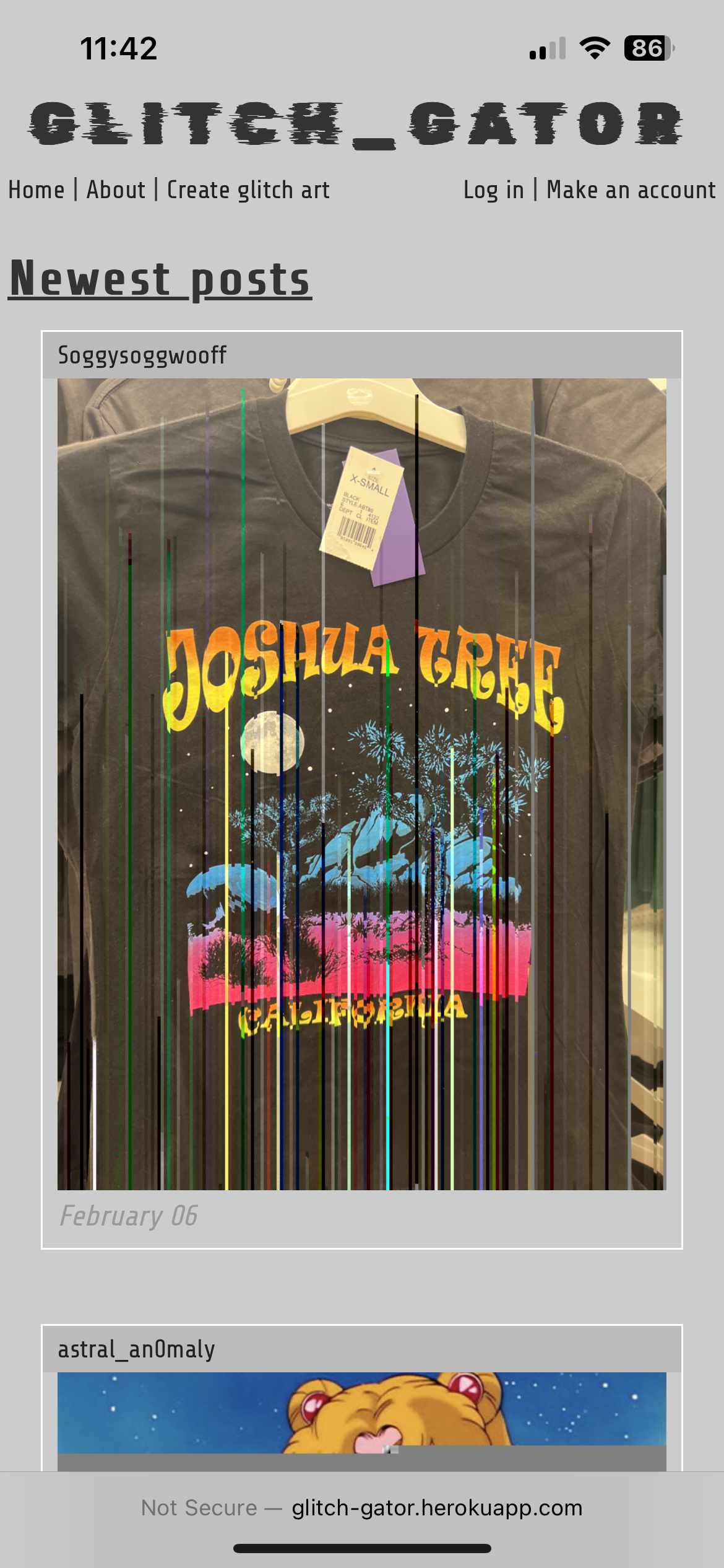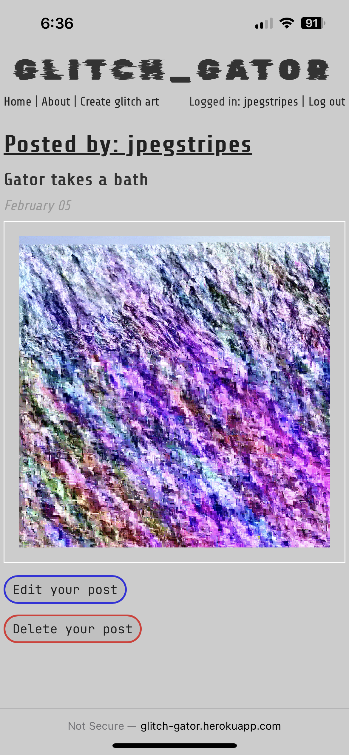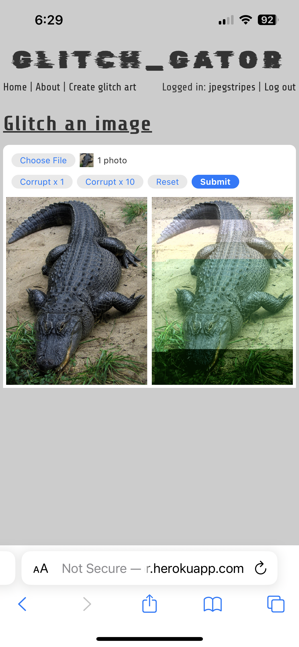 'Glitch Gator' is a 'GLITCH art GenerATOR'. You can upload your own images to create glitch art, and share your results! Check out the deployed site here: https://glitchgator.com/