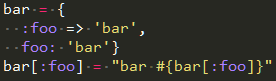 bar[:foo] = 'bar #{bar[:foo]}'Monokai screenshot: