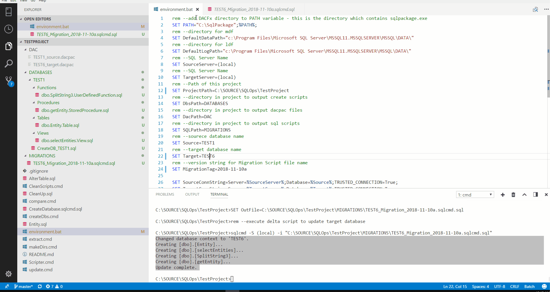 This will execute sqlpackage.exe to create dacpacs and a delta script called %DatabaseName%_Migration_%MigrationTag%.sqlcmd.sql showing the diffenece in schema between the two dbs.