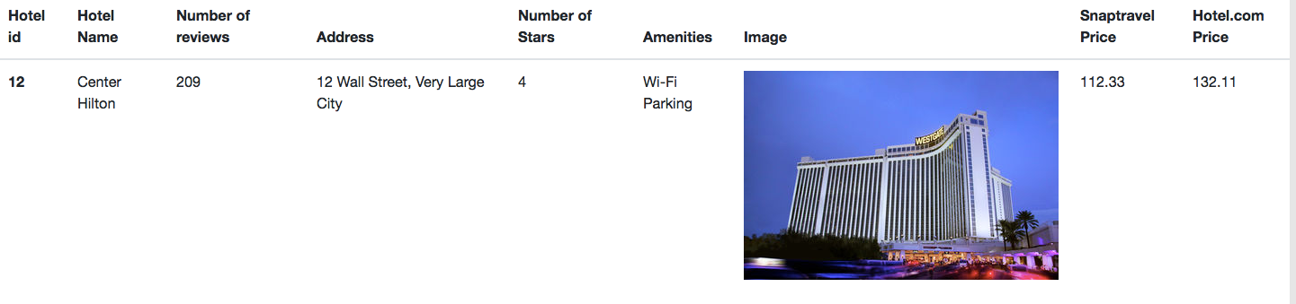 After both these calls have returned take only the hotels that appear in both the responses and return an html table with the data. (you can display the data in anyway you wish as long as the data is in a table with a row for each entry)