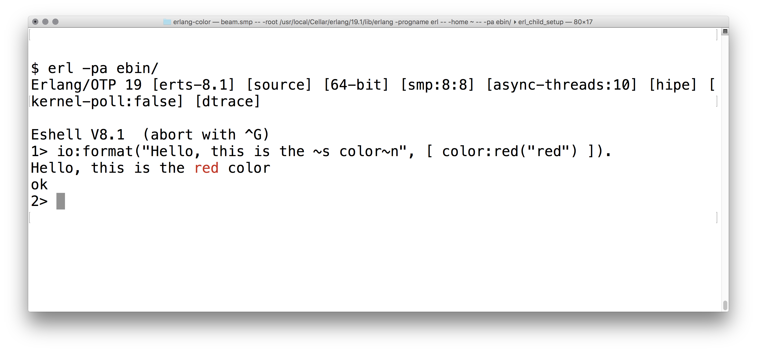 1> io:format("Hello, this color is ~s~n", [ color:rgb([0,1,0], "green") ]).Note: as of this writing, 24-bit colors (ISO-8613-3) are not widely adopted in terminal emulators. Konsole and iTerm2 nighly builds are known to support them.