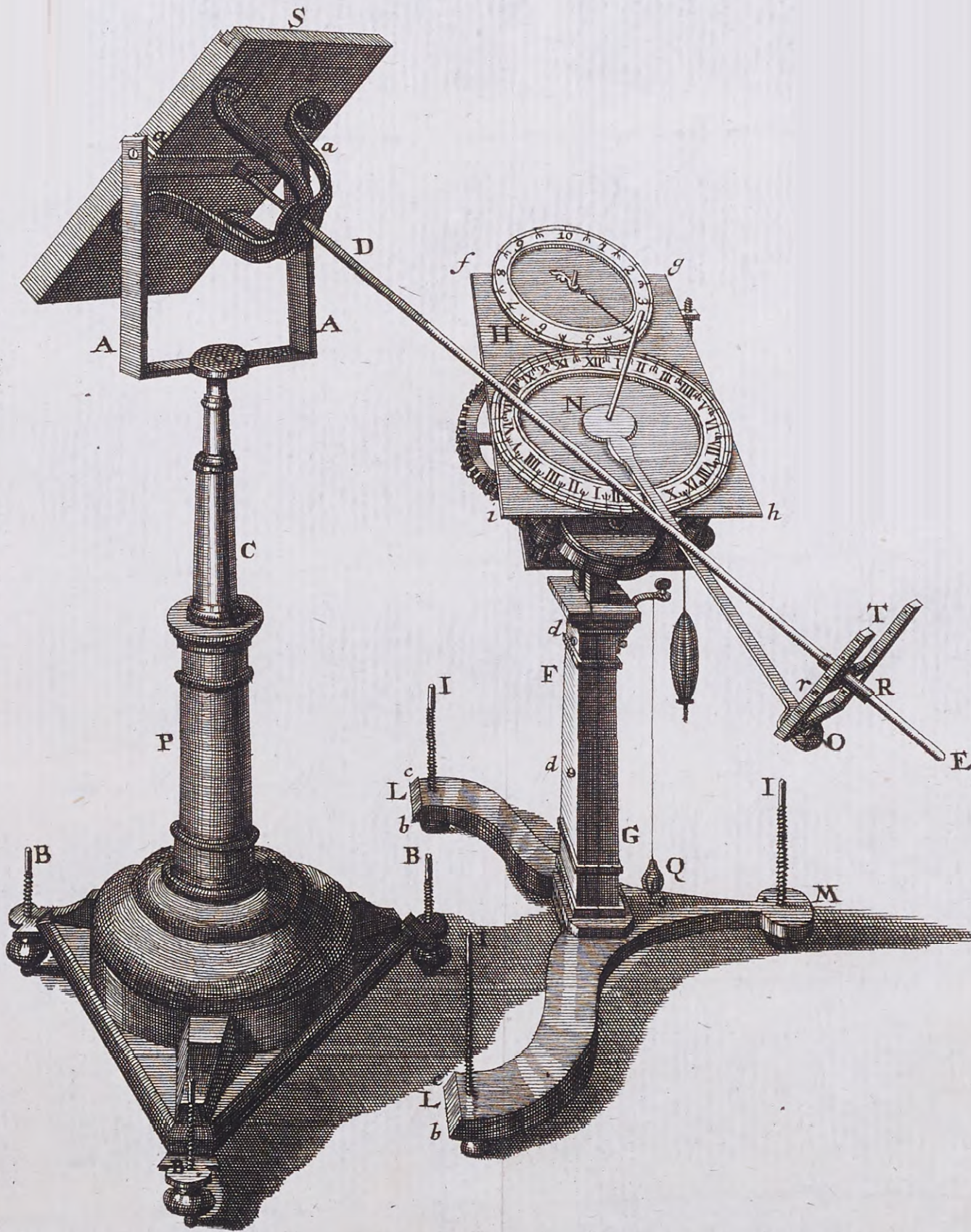 2672: L'orologio è sostenuto da una colonna di rame FG; essa è costituita da due parti che sono unite dalle Viti d, d, tra le quali, si muove una piastra di ferro, nel mezzo della quale vi è una fessura come nella vagina, attraverso la quale passano le suddette Viti d, d. Questa piastra è solidale con la parte inferiore dell'orologio, che viene sollevato e abbassato con questo metodo, ed è mantenuta in posizione dalle viti d, d. Le viti I, I, I, passando attraverso la piastra di rame LLM, alla quale è fissata la Colonna FG, possono essere usate anche per regolare l'altezza dell'orologio.