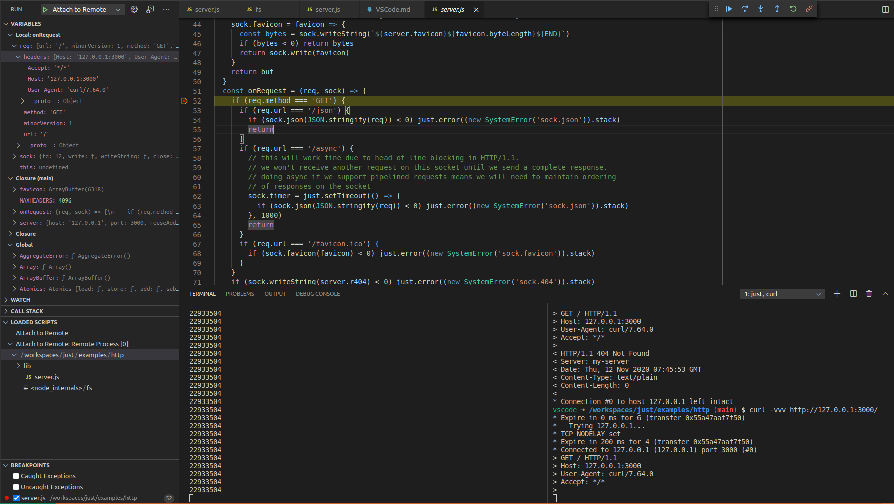 },give it a couple of seconds to hook up and you should see "server.js" appear in the "Loaded Scripts" section. You may need to expand the workspaces to see it.