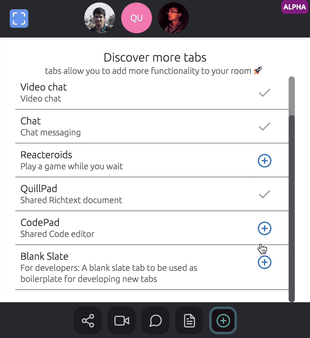 There is a concept of mini-applications called tabs each of which add a unique capability to the room. They are loaded dynamically with a click of a button
