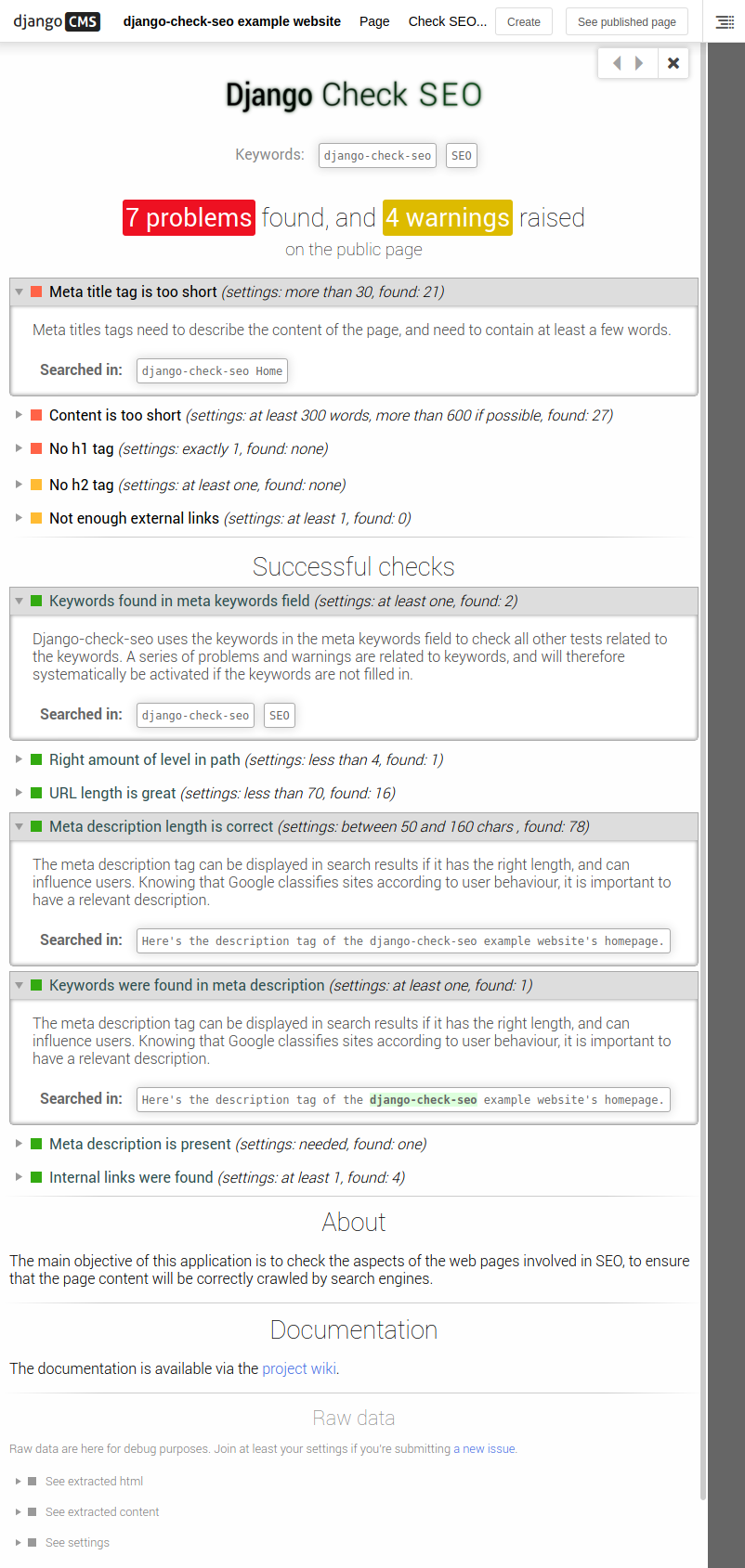 In other words, django-check-seo will tell you if you have problems concerning a broad range of SEO aspects of your pages.