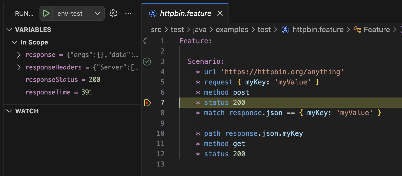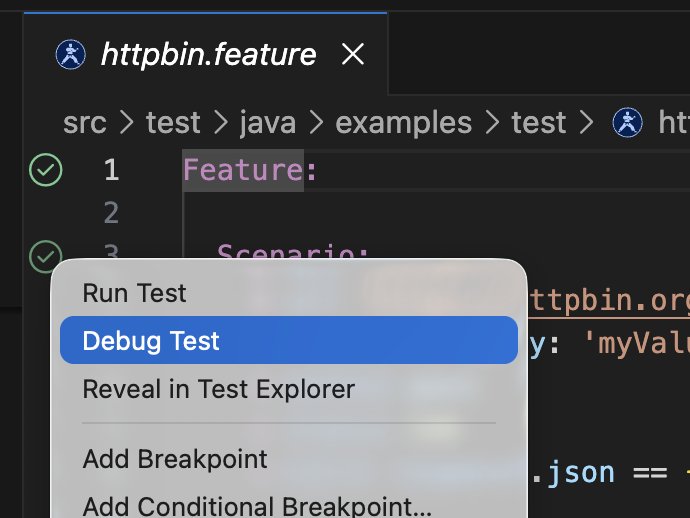 Set breakpoints in .feature files and debug with the Test Explorer debug profile. Works in both karate-cli and vscode-java modes. With Karate v2, you can also debug embedded JavaScript — step through JS expressions, inspect variables, and set breakpoints in inline scripts.
