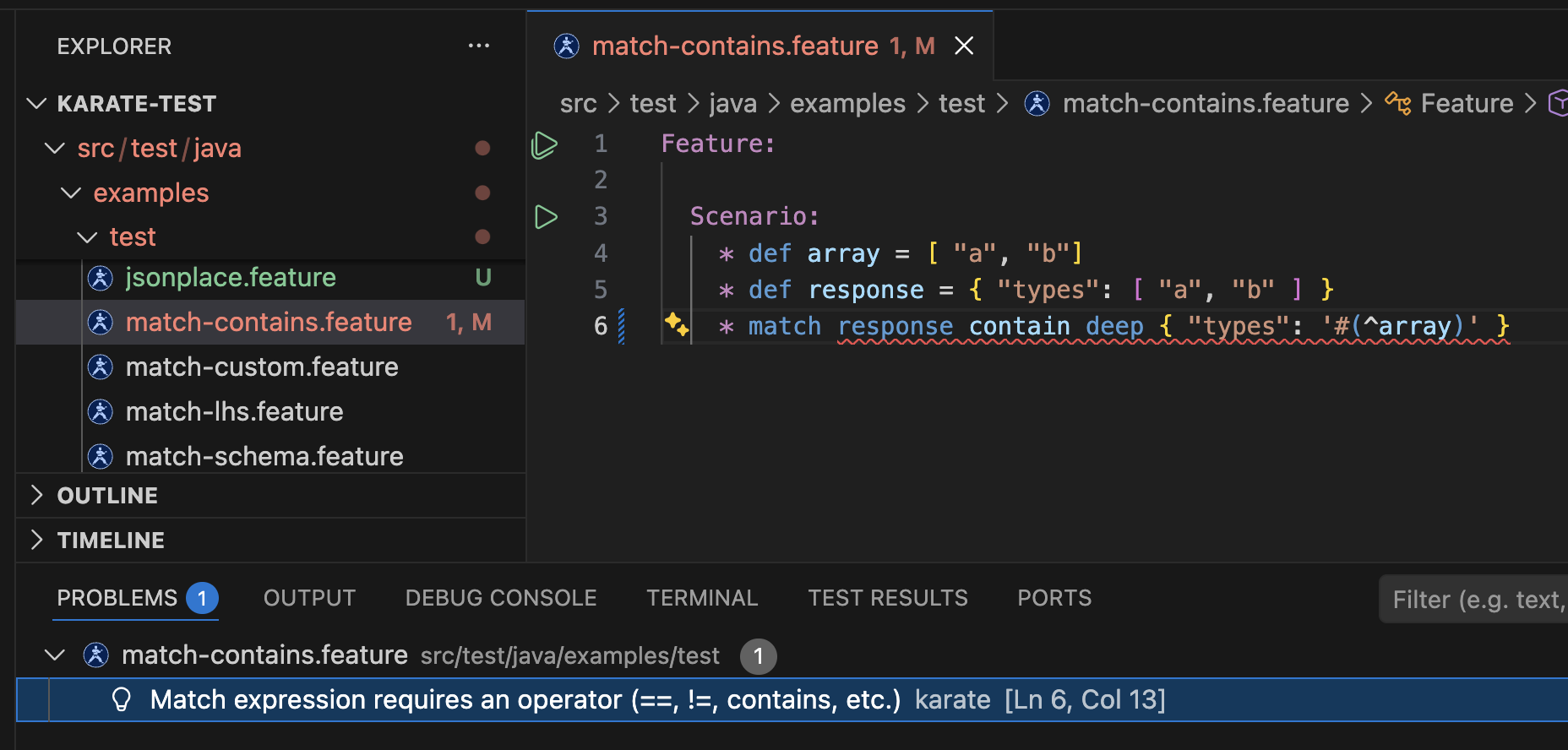 - Match Syntax Diagnostics - Syntax errors in Karate feature files highlighted and appears in "Problems" tab