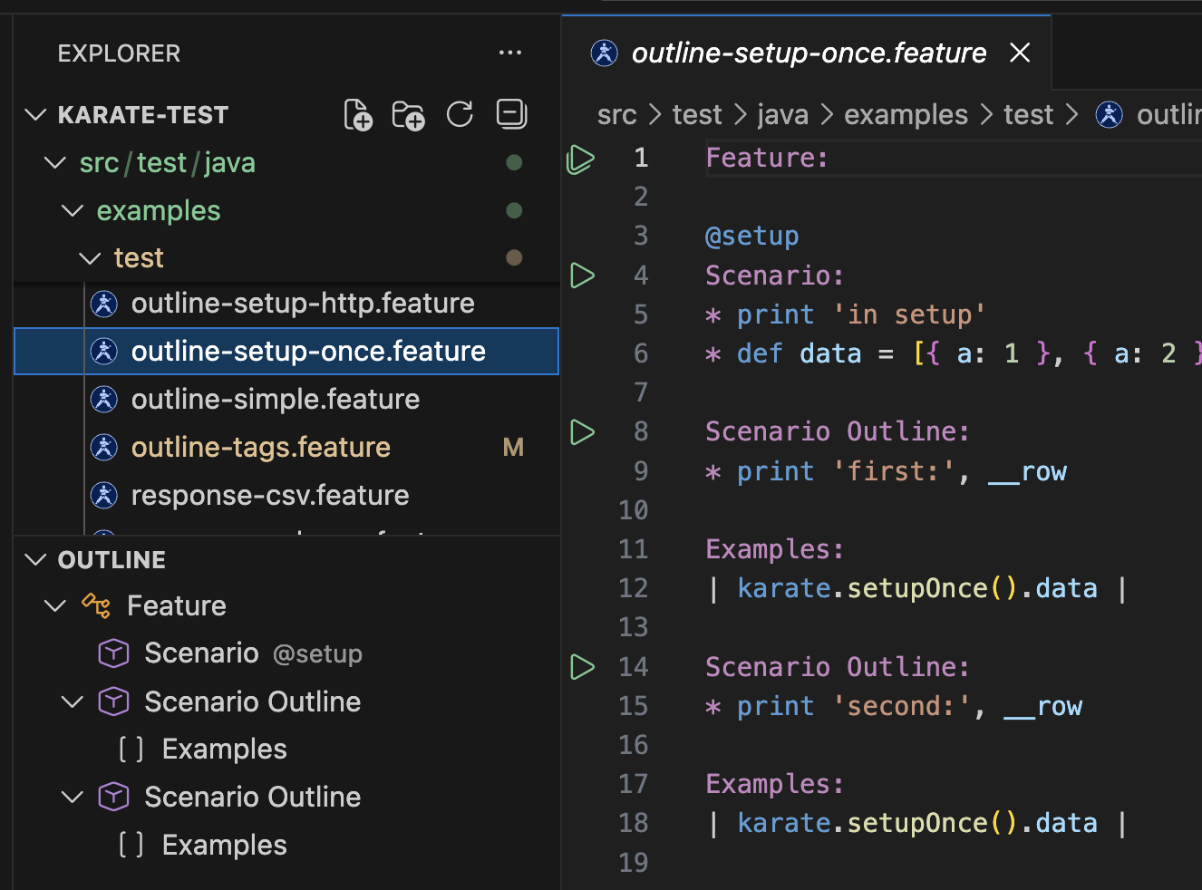 Feature / Scenario / Scenario Outline tree in the Outline sidebar.
