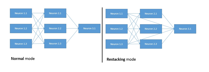 The second mode (also called restacking) assumes that each layer uses previous neurons activations as well as all previous layers neurons (including the input layer). Therefore the previous formula can be re-written as: