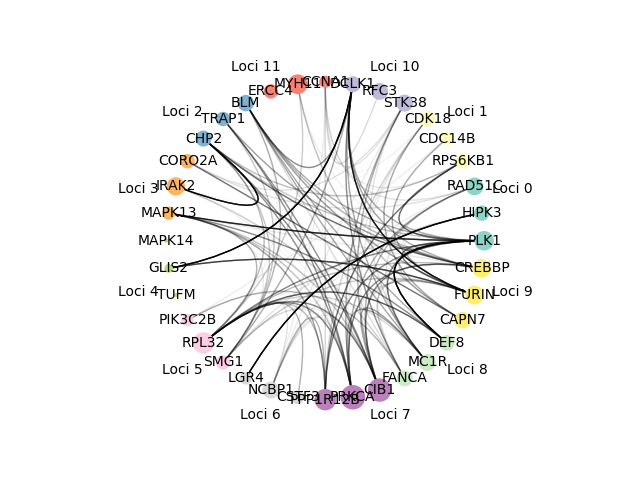 Networks can be visualized to show either the n genes with the highest gene scores or the n genes with the highest scores regardless of loci. They are visualized such that color represents loci of gene, size represents the gene score (bigger node means higher score), edges are from the STRING database with the darkness corresponding to the weight of the edge. The corresponding gene names, loci, gene scores from the visualized network are the output to a specified file.