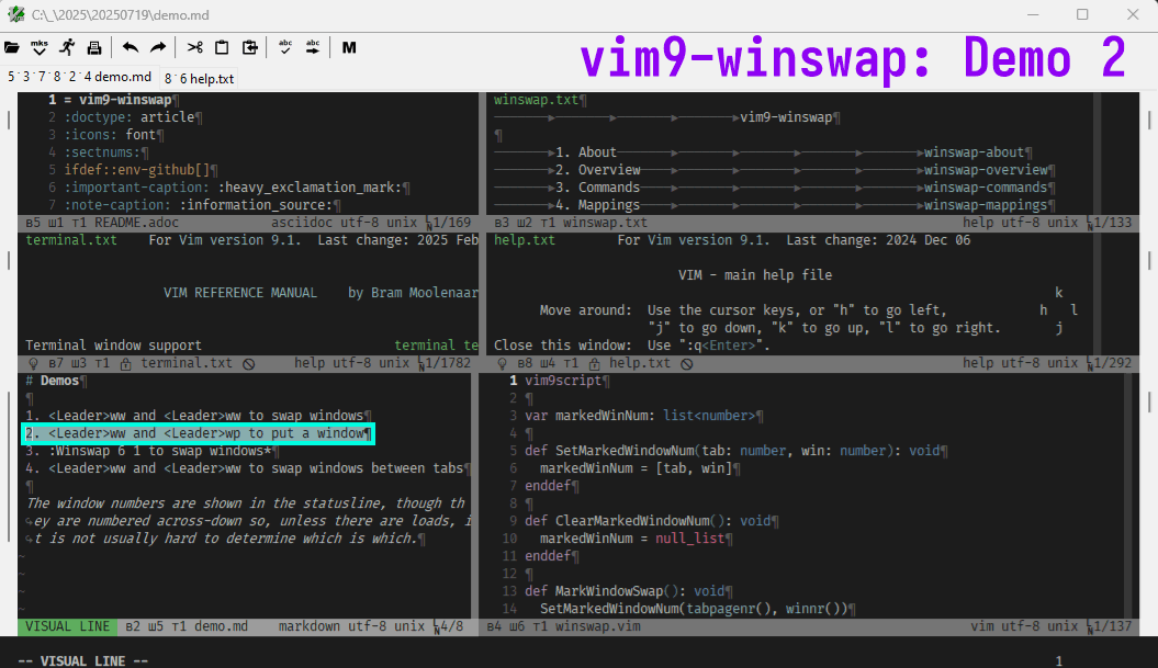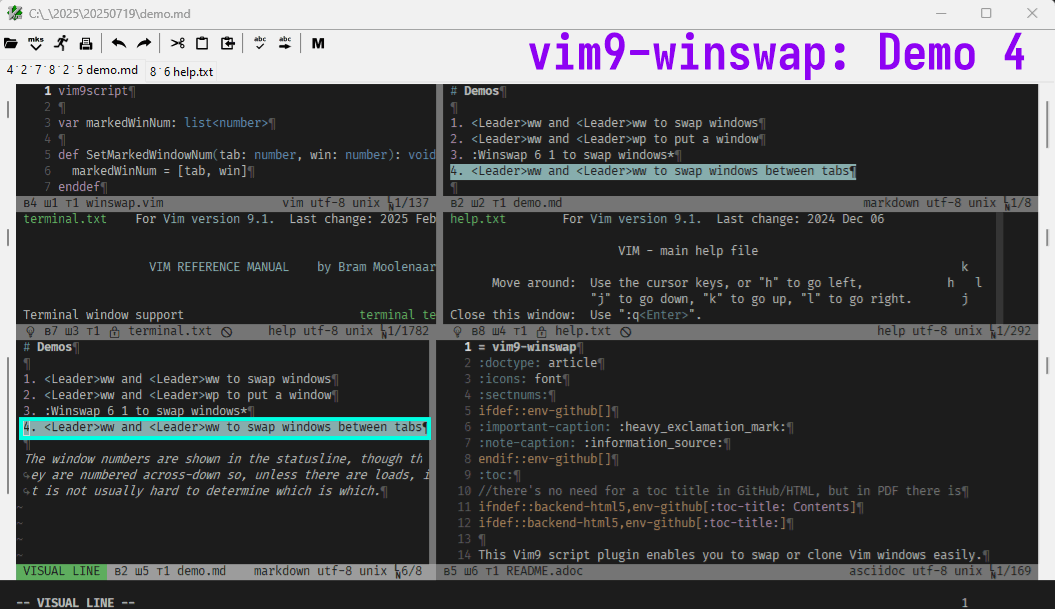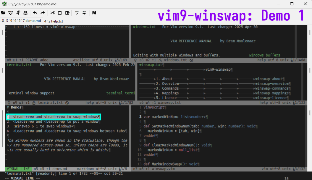 This Vim9 script plugin enables you to swap or clone Vim windows easily. As a Vim9 script plugin, it works with Vim exclusively, and requires Vim version 9 (though from 8.2.4883 should work too).
