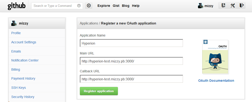 Main URL と Callback URL に、自分の環境にあった値を設定し、「Register application」をクリック。
