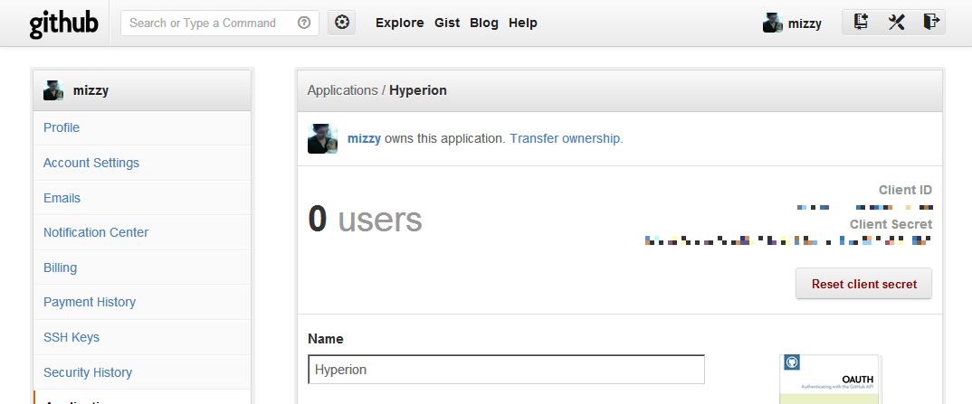 ここで表示されている Client ID と Client Secret を「開発に必要なファイルの生成」で生成した config/settings/development.yml に設定します。また、organization には、アクセスを許可する人が属する GitHub 組織アカウントを指定します。