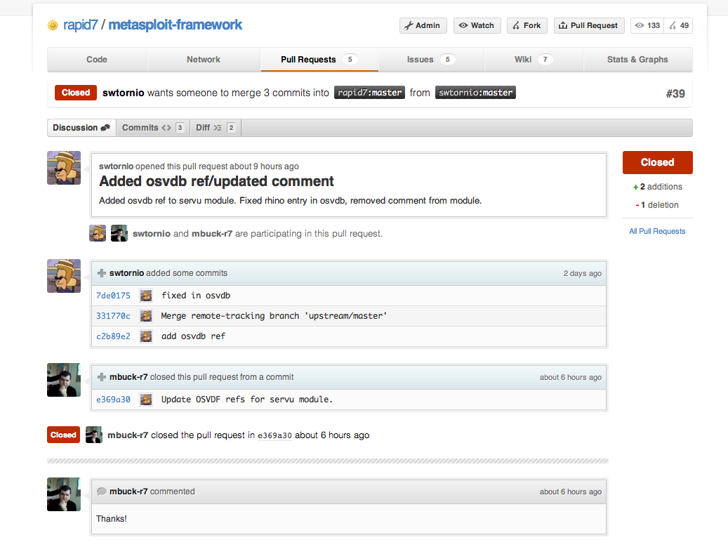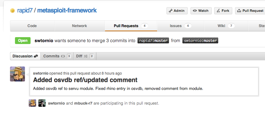 $ git remote add swtornio git://github.com/swtornio/metasploit-framework.gitMaking the remote name match the user's name keeps things simple.
