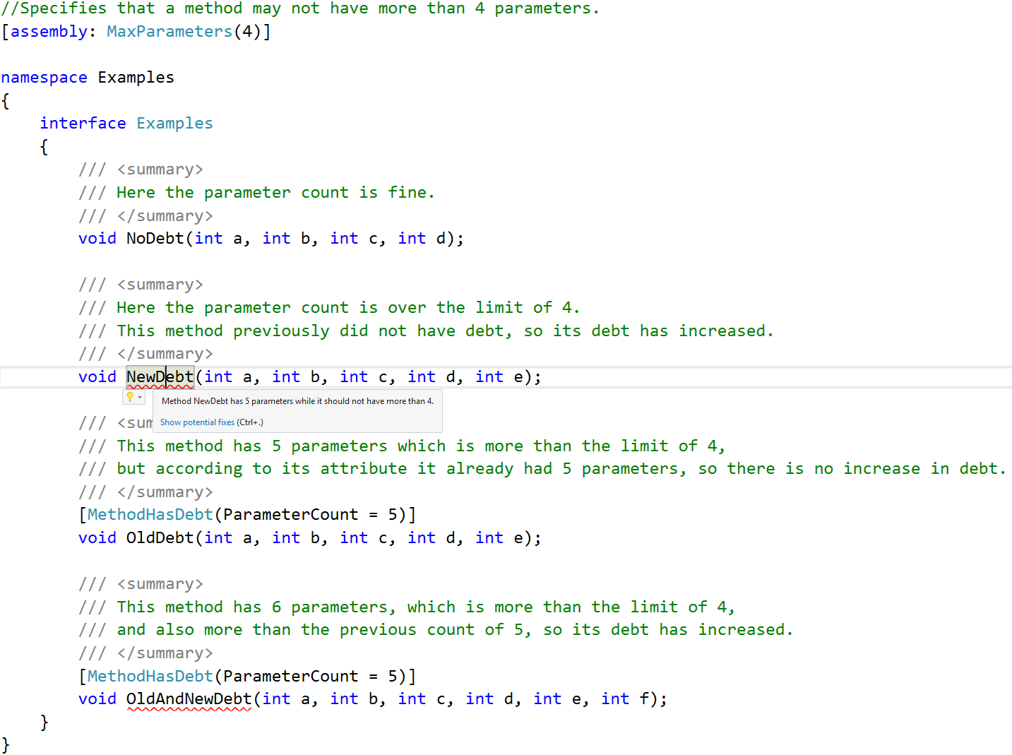 In the example you will see the attribute MethodHasDebt above two methods. This indicates already existing debt, allowing us to differentiate between new and old debt.