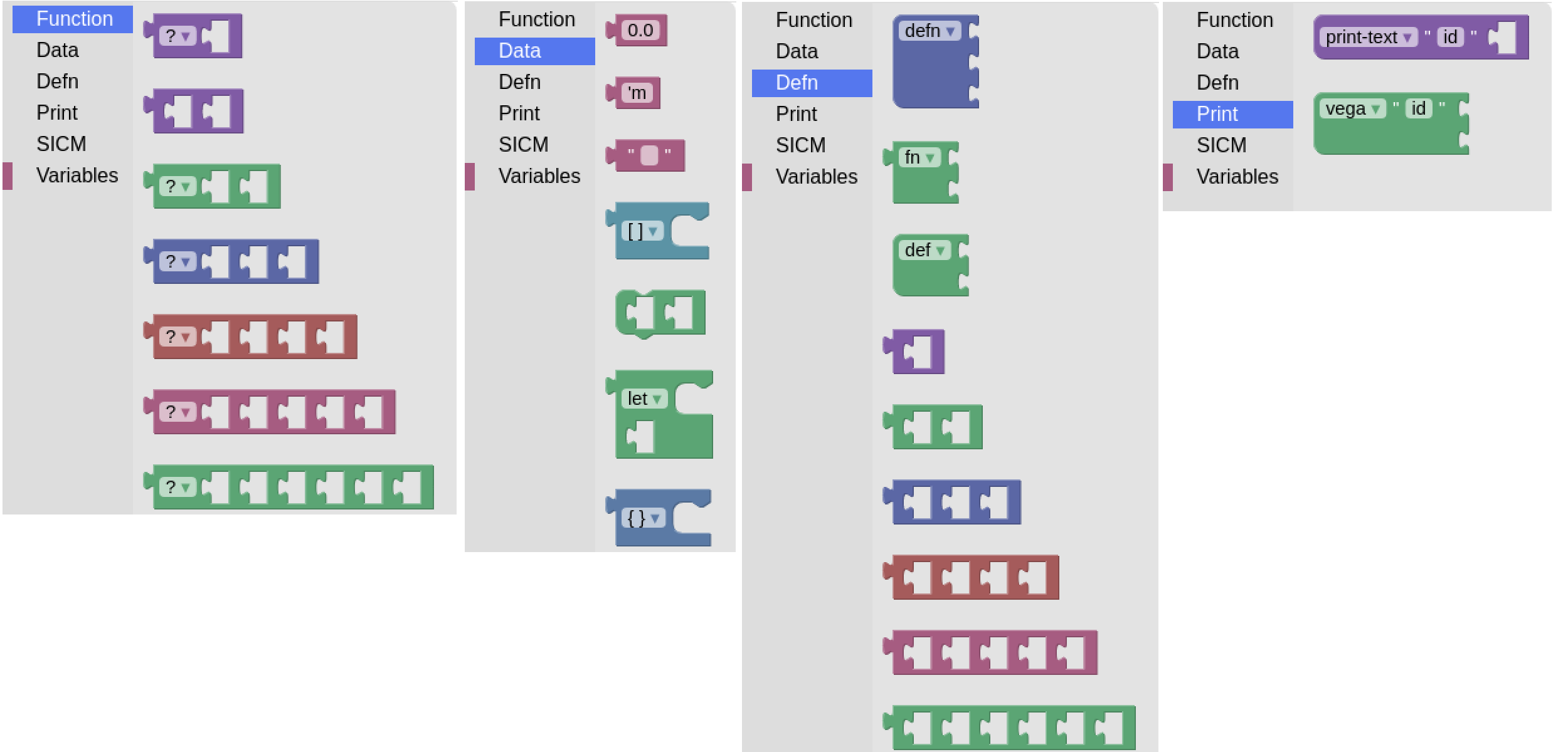 So, the chosen building blocks move away from the code-is-data paradigm. Because they allow to represent the same edn-vector in two different graphical ways. This means that in the workspace examples a choice is made, a choice for a certain (and hopefully gentle) Syntax to represent Clojure-code.