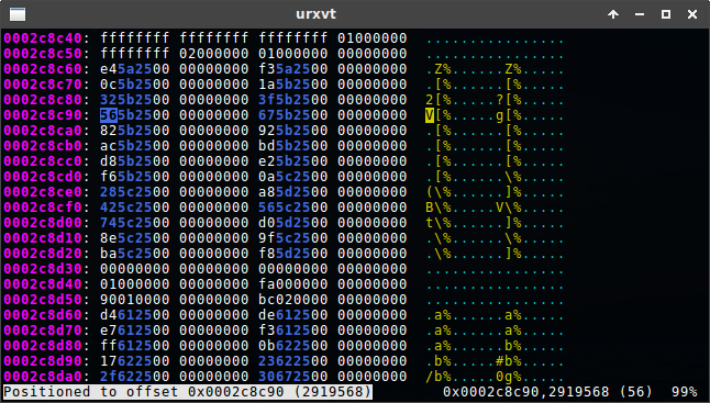 :123: go to offset 123 (base 10):0x7a69: go to offset 0x7a69 (base 16), 31337 in base 10.:w: writes the file.:q: quits (will warn if the buffer is dirty).:q!: quits promptly without warning.set o=16: sets the amount of octets per line.set g=8: sets grouping of bytes.