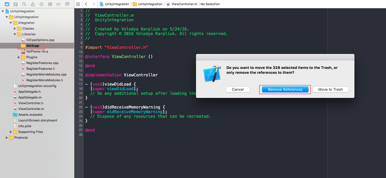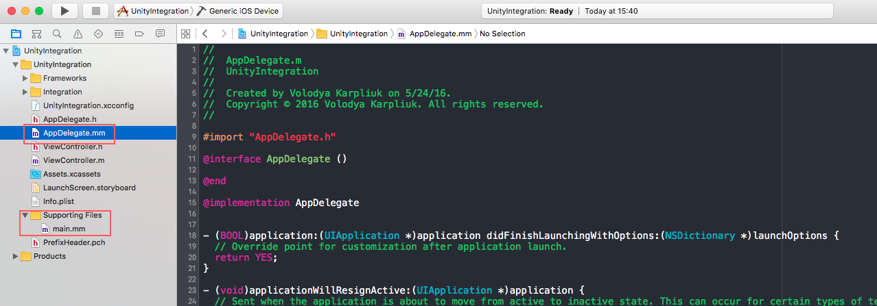 As soon as we need to use files from previously Unity-generated iOS project, you can put the projects together in a common directory. Do not delete project generated with Unity even after all steps done.