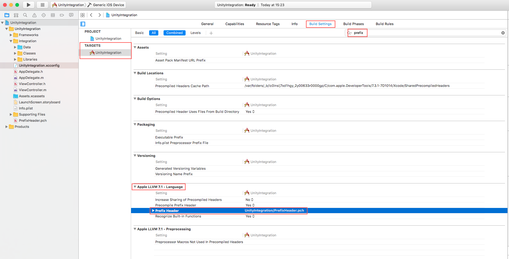 Now in the Build Settings under Apple LLVM 7.1 - Language section, find the field called Prefix Header and instead of /ENTER/PATH/HERE add path to previously created file, e.g.: YOUR_PROJECT_NAME/PrefixHeader.pch which in my case is: UnityIntegration/PrefixHeader.pch