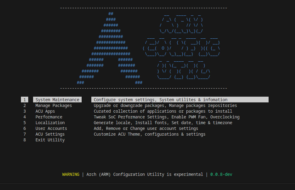 Configuration Utility: ACU offers functionalities akin to popular configuration tools such as armbian-config or raspi-config or rsetup but for Arch Linux.