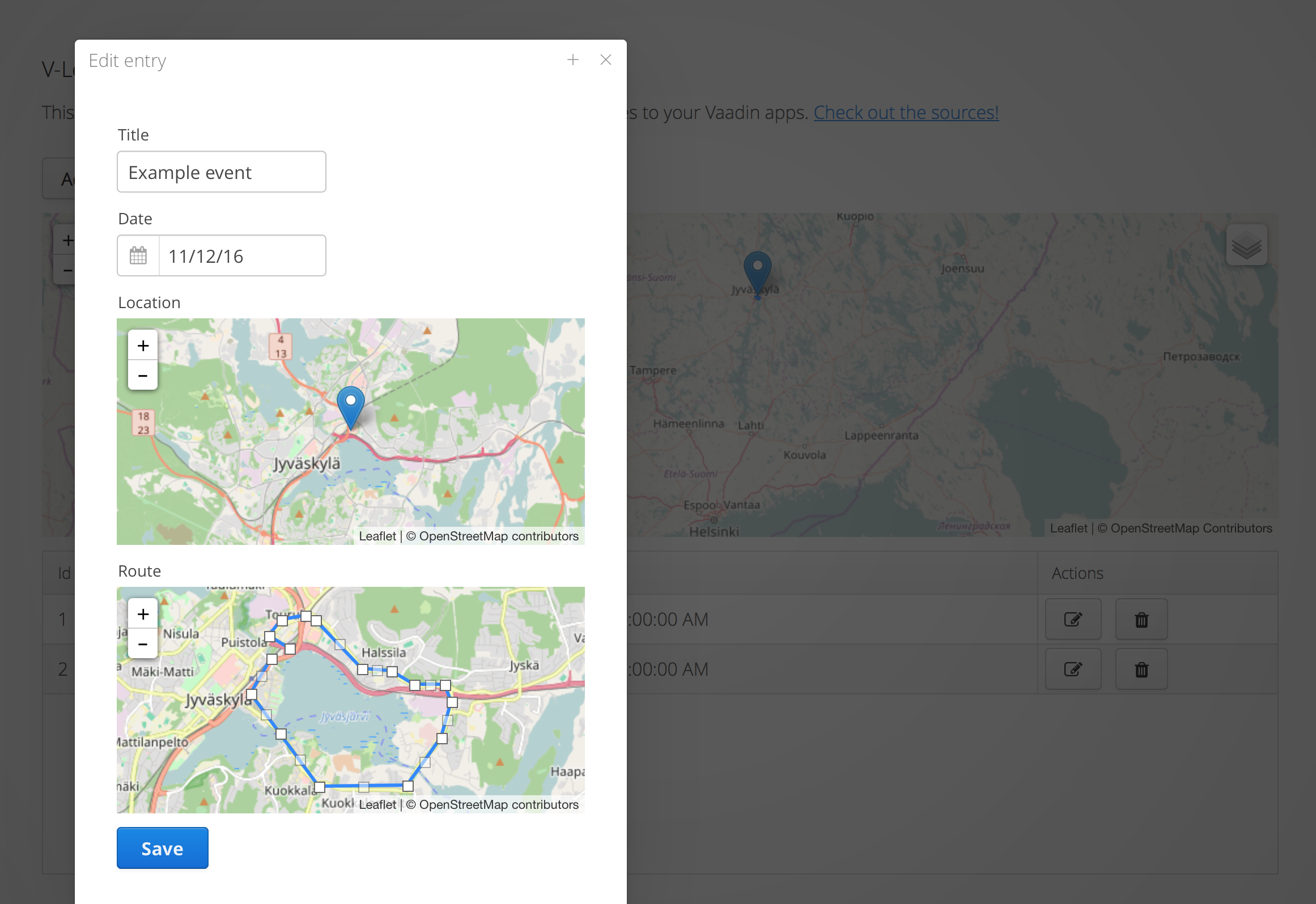 - Vaadin and V-Leaflet add-on to build the UI layer. V-Leaflet is a Vaadin wrapper for Leaflet, the awesome slippy map library. With V-Leaflet we use the Editable extension and its Vaadin Field implementations which make it dead simple to edit JTS data types directly from the JPA entities.